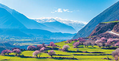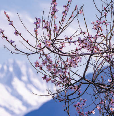 怒放的桃花与远方的雪山相映澄净。 图为本报记者徐驭尧摄