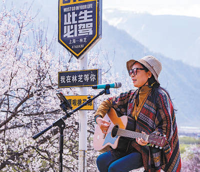 游客在桃花节现场马虎弹唱。 图为本报记者徐驭尧摄