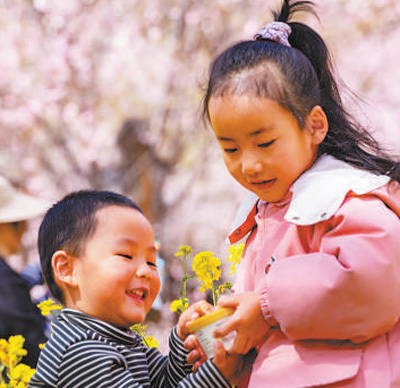 小一又友在桃树下欣忭玩耍。 图为本报记者徐驭尧摄