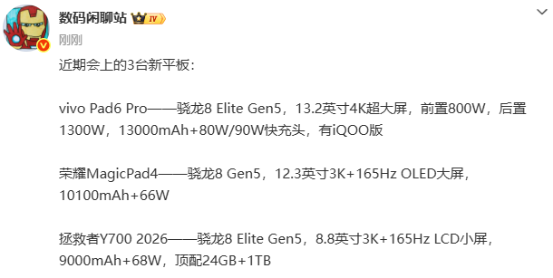 【CNMO科技音讯】3月3日,CNMO郑重到,据博主“数码座谈站”裸露,2026年3月,安卓平板阛阓迎来新一轮家具迭代。vivo、荣耀、联念念三大品牌均缱绻推出搭载旗舰出动平台的新品,掩盖大屏、超薄及小尺寸游戏等细分阛阓。